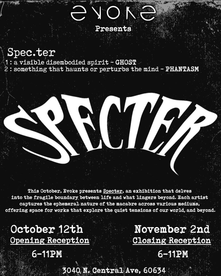 Evoke presents Specter, an exhibition that delves into the fragile boundary between life and what lingers beyond. Each artist captures the ephemeral nature of the macabre across various mediums, offering space for works that explore the quiet tensions of our world, and beyond.